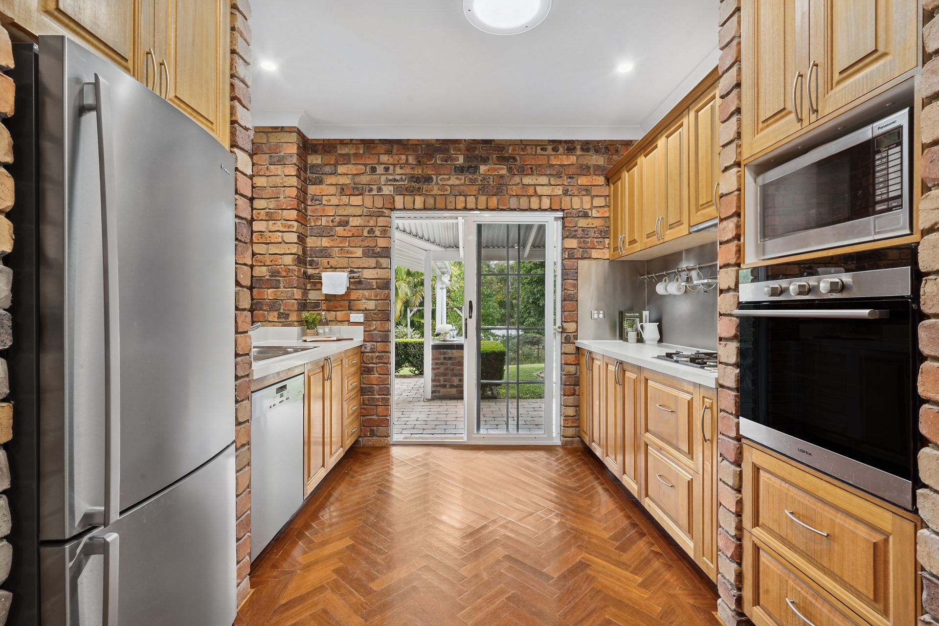 • Kitchen with dishwasher, gas cooktop, electric oven, and garden outlook.
