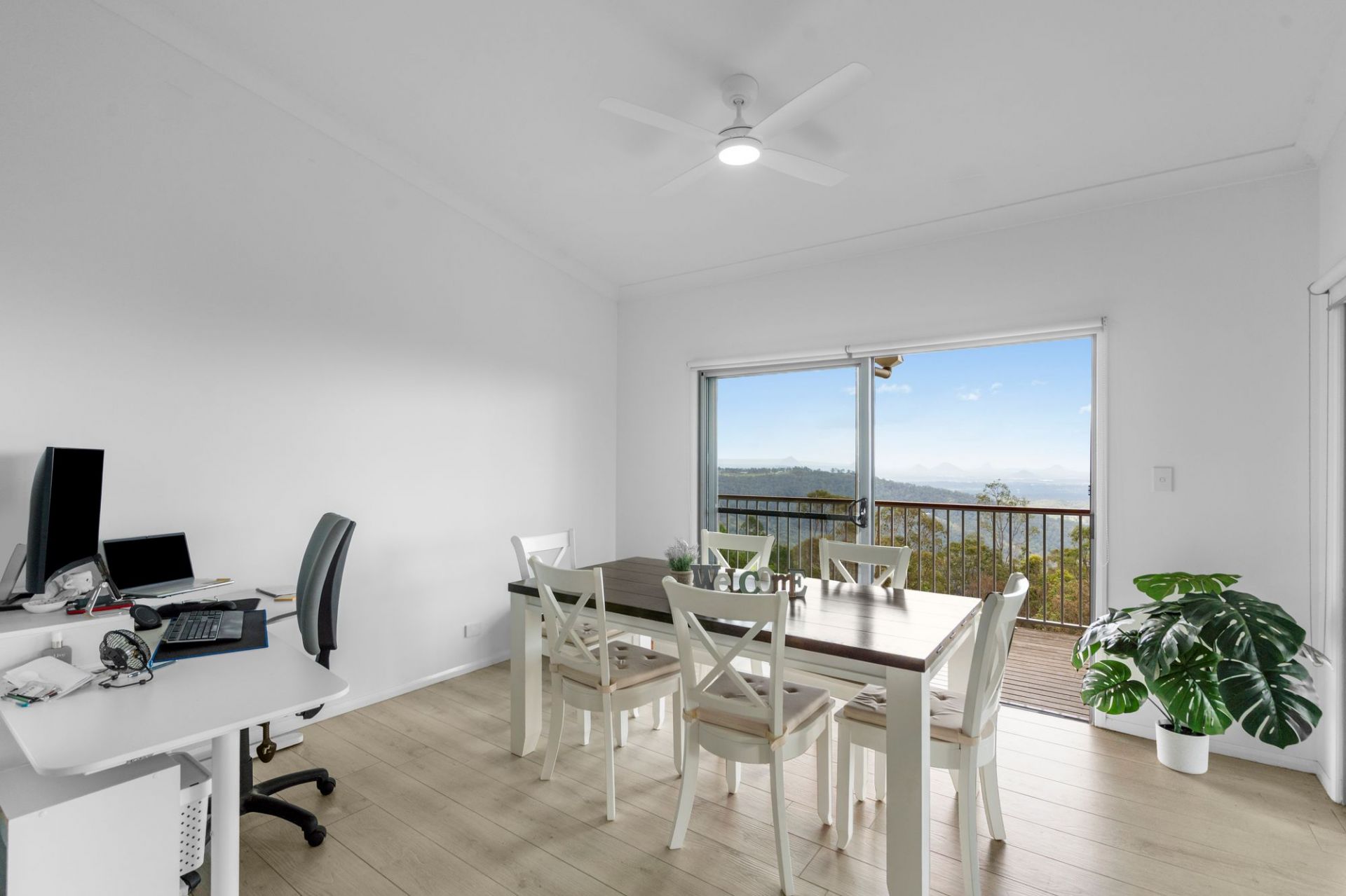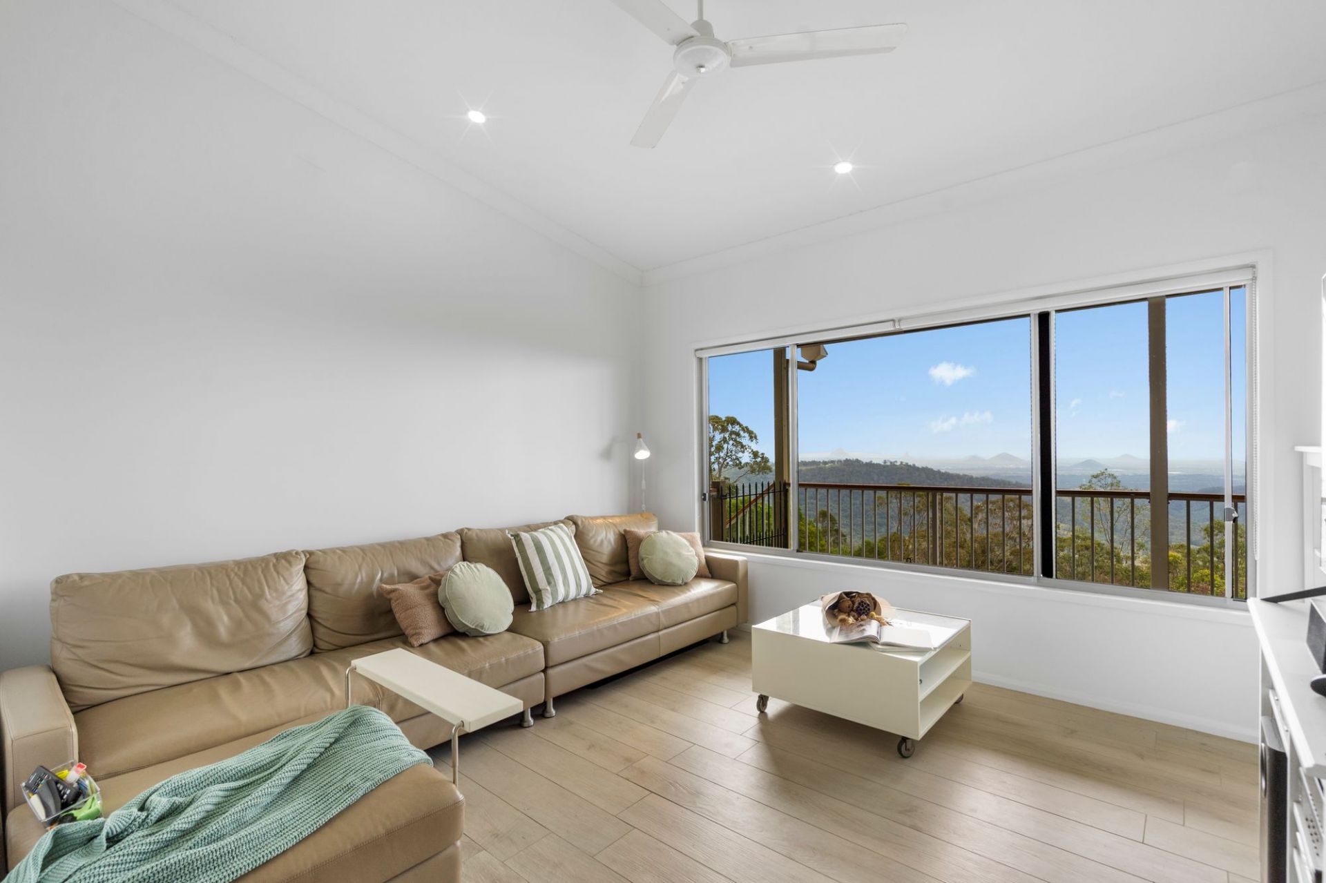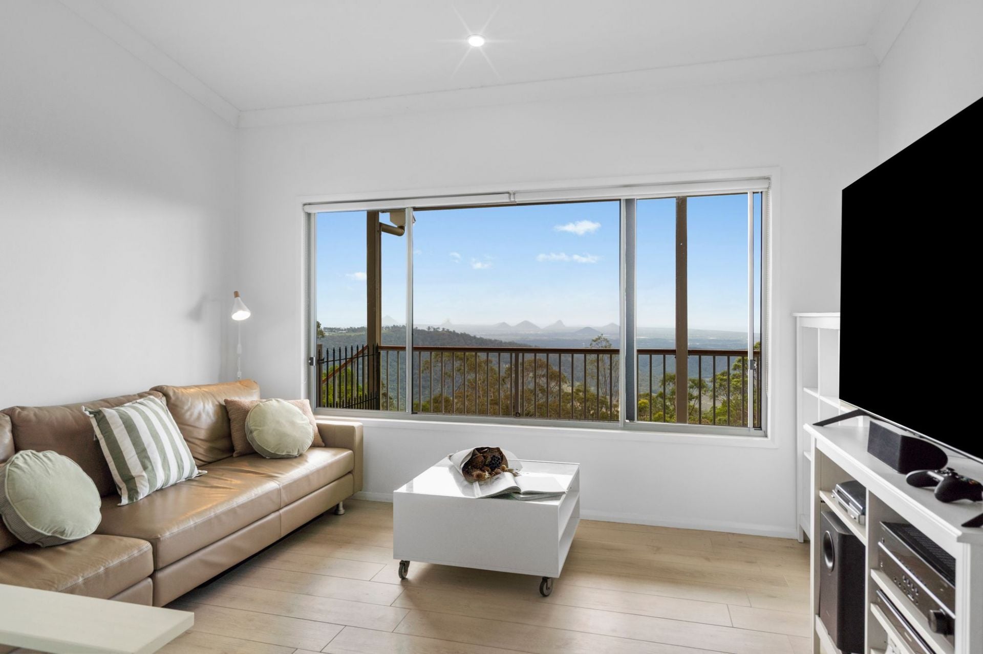 Freshly painted throughout, the heart of the home is a sun-drenched, open plan living, dining, and kitchen area, complete with elegant stone benchtops, soaring 3.2m ceilings, and a full glass outlook over the Glass House Mountains, Moreton, Caloundra, and Bribie. Step outside from the living area to a spacious deck, the perfect spot to sit back, relax, and enjoy the panorama.