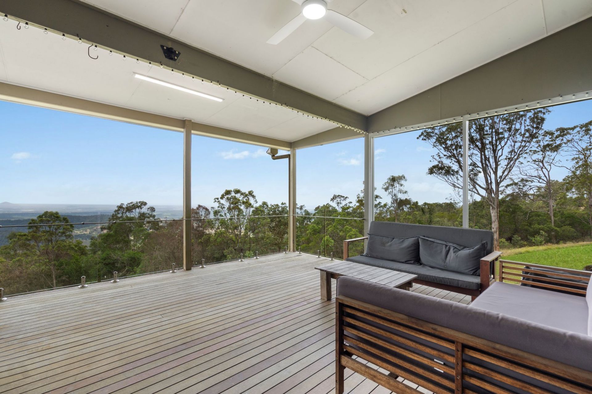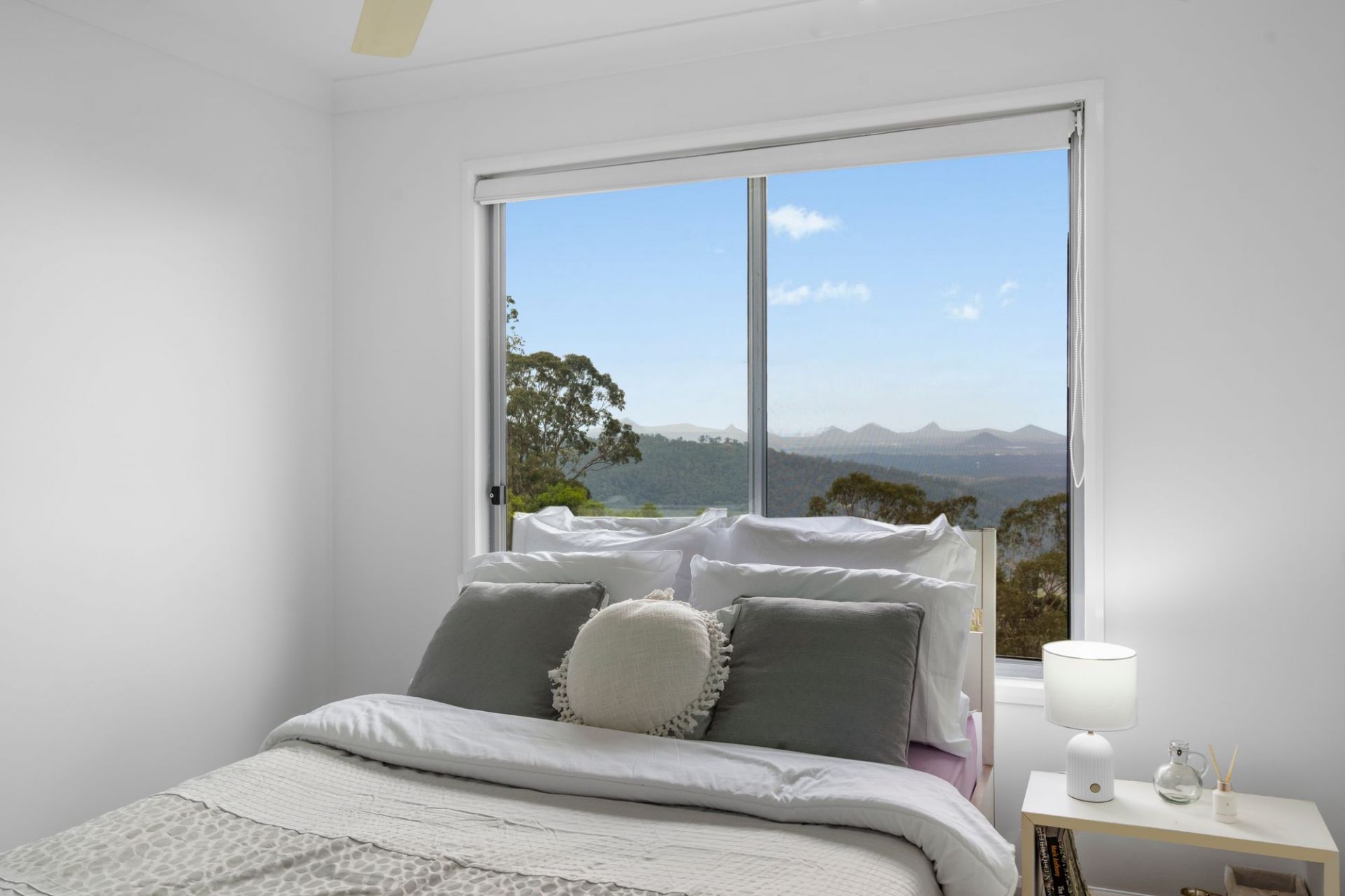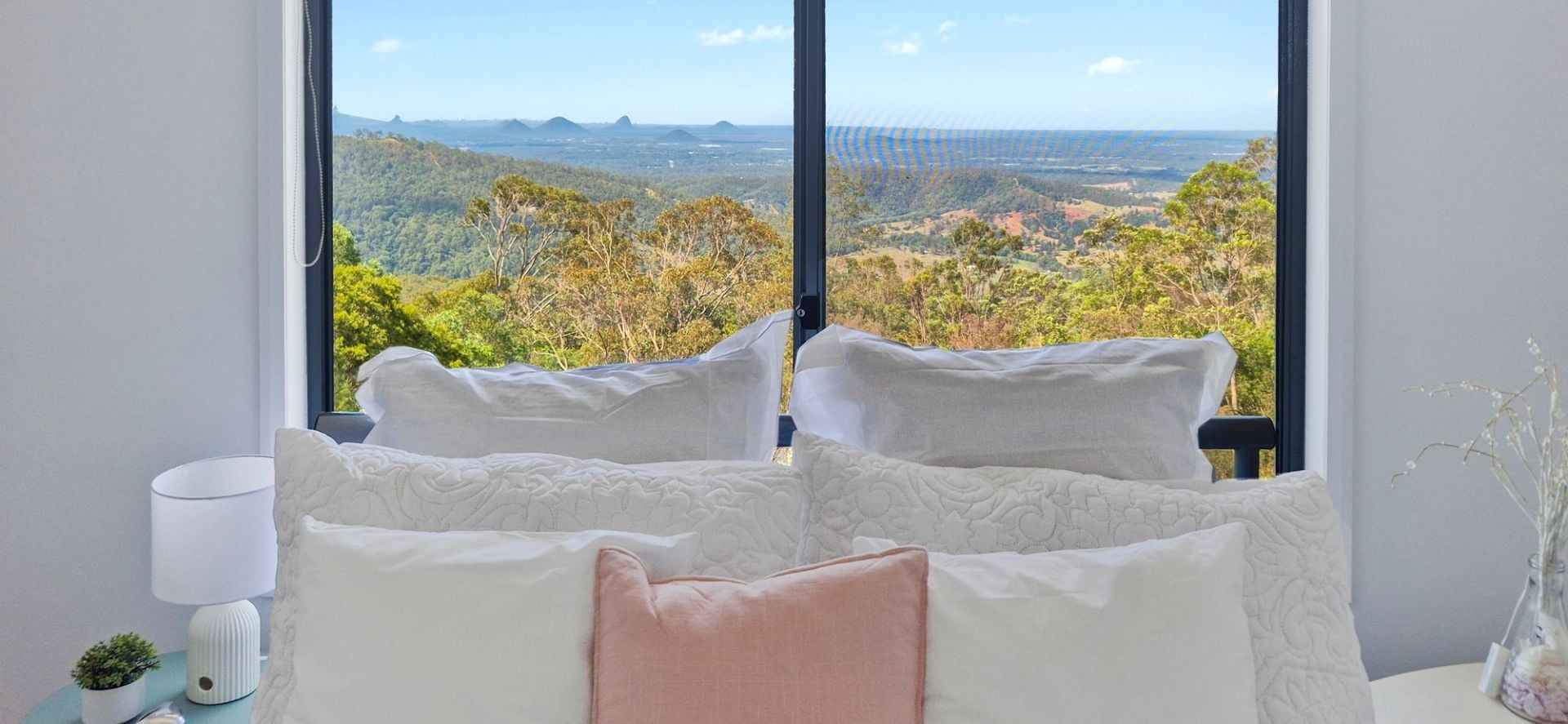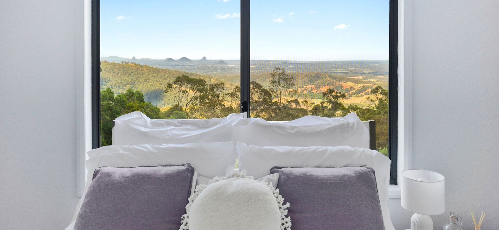 Freshly painted throughout, the heart of the home is a sun-drenched, open plan living, dining, and kitchen area, complete with elegant stone benchtops, soaring 3.2m ceilings, and a full glass outlook over the Glass House Mountains, Moreton, Caloundra, and Bribie. Step outside from the living area to a spacious deck, the perfect spot to sit back, relax, and enjoy the panorama.