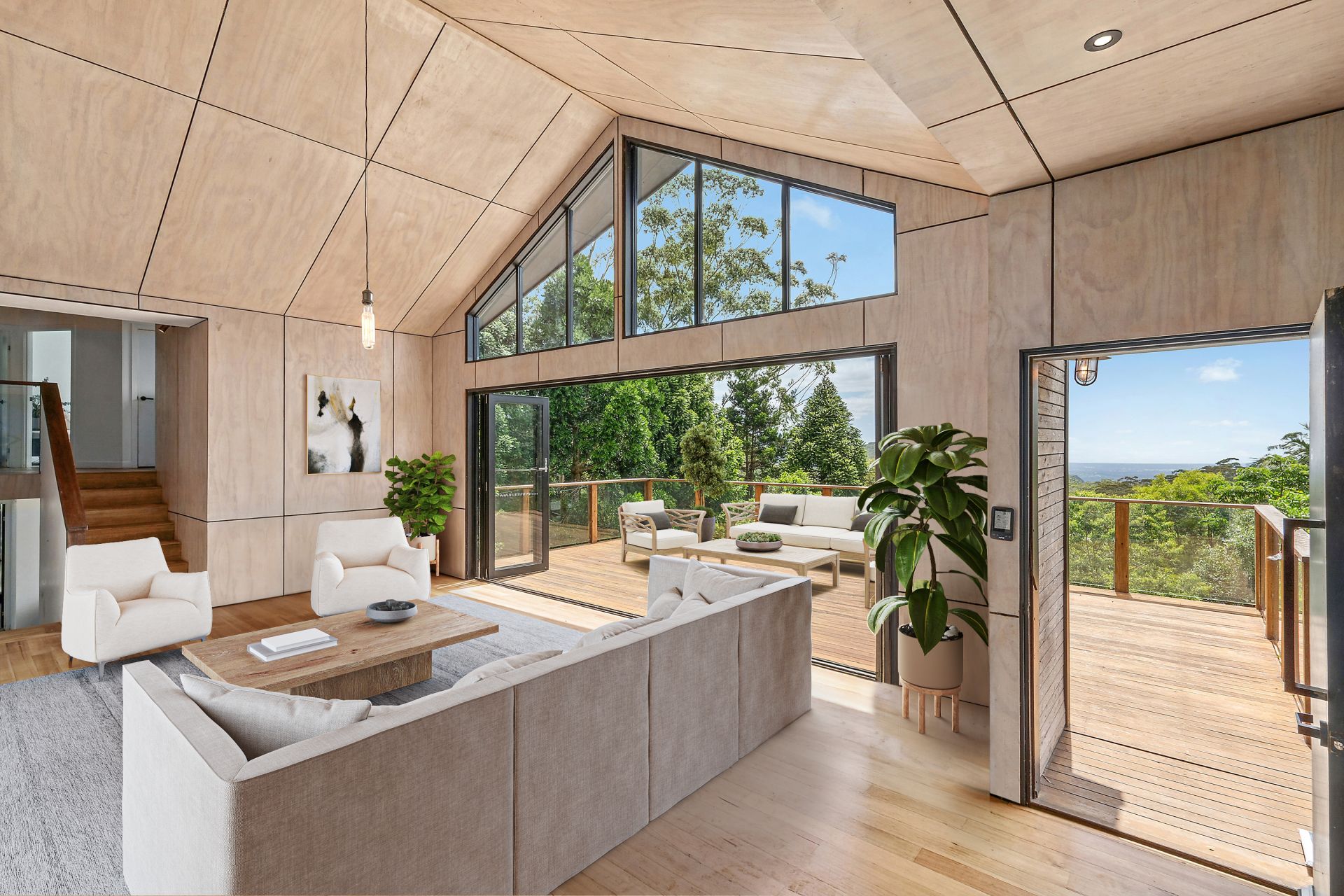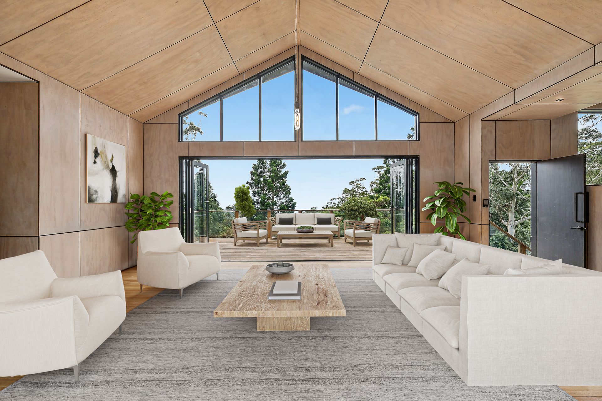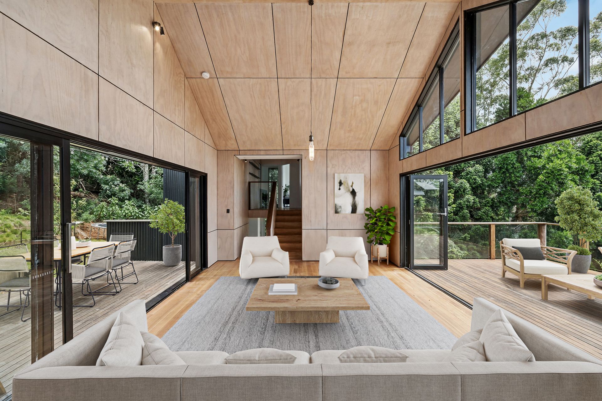 Privately positioned within a serene rainforest setting, the home has been thoughtfully designed to embrace its natural surrounds while offering seamless indoor–outdoor living. A dramatic open-plan living pavilion forms the heart of the home, where soaring cathedral ceilings, warm timber floors, and walls of glass create an immediate sense of scale, light, and connection to the landscape.