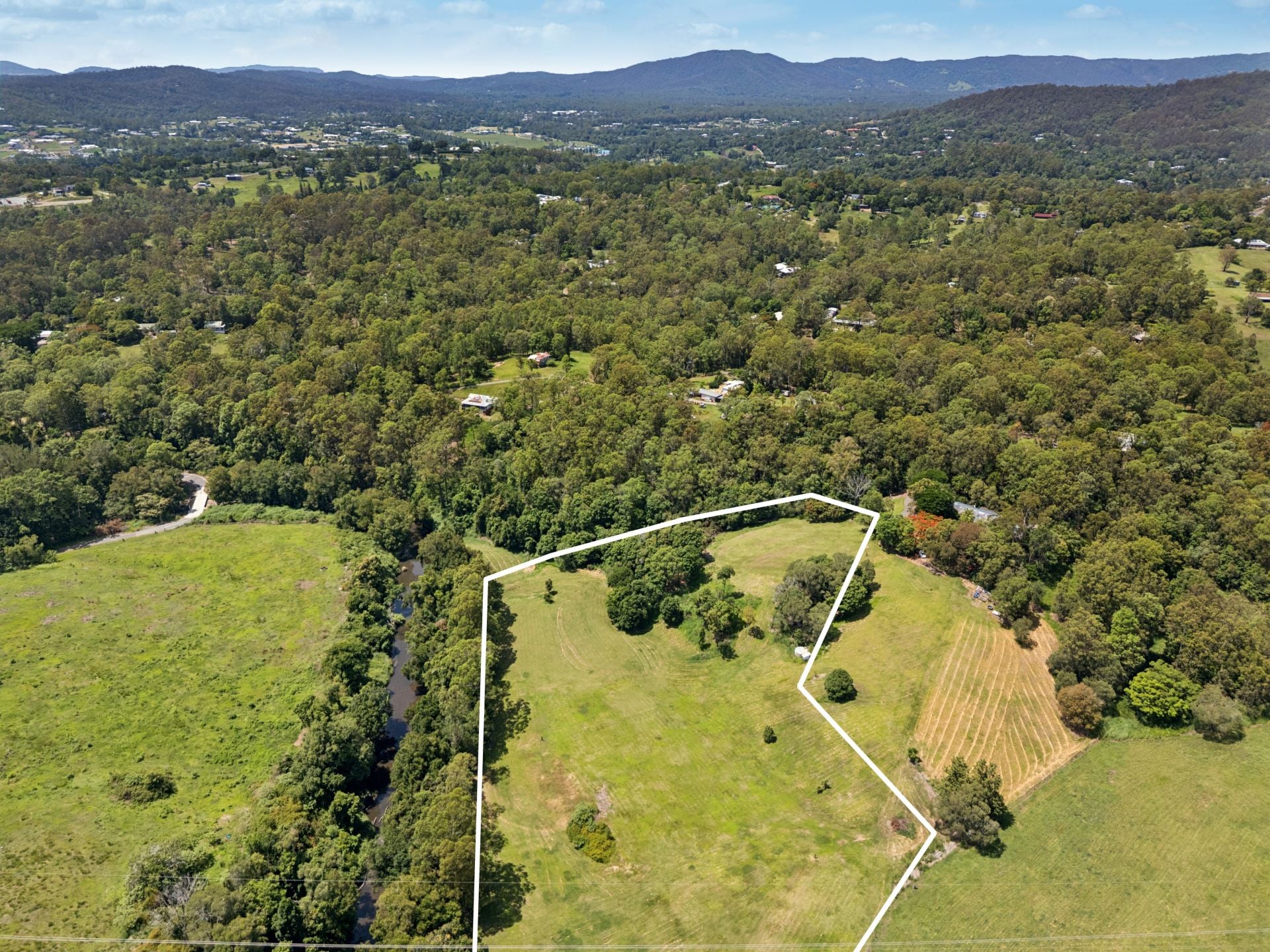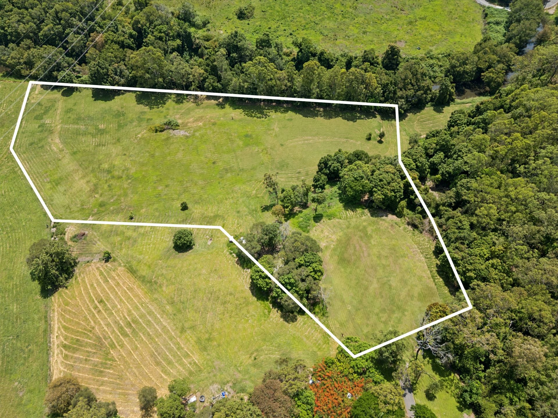 The land unfolds across flat paddocks and expansive grassy clearings, framed by natural greenery and a picturesque creek, delivering both functionality and tranquillity. With power already connected and excellent scope for on-site treatment systems, water tanks, and irrigation, the groundwork is in place to move forward with confidence.