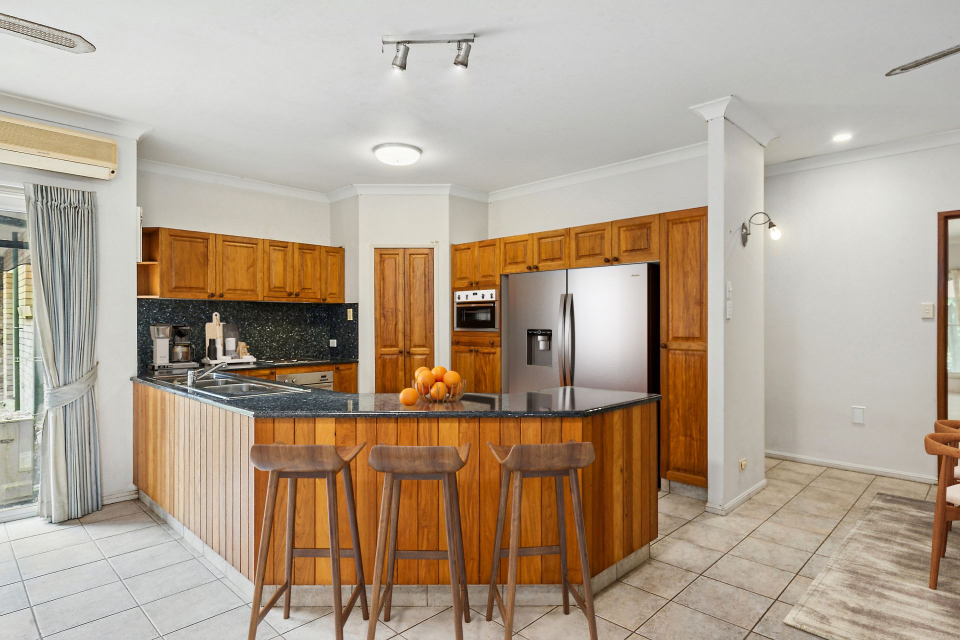 • Open-plan kitchen featuring stone benchtops and timber finishes