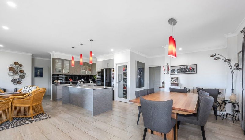 The home offers generous living space with four King Sized bedrooms, a convenient study nook, ensuite, and a main bathroom designed for family comfort. Multiple living zones include a living room, family room, meals area with stacker doors, and separate dining room, providing flexibility for everyday living and entertaining.