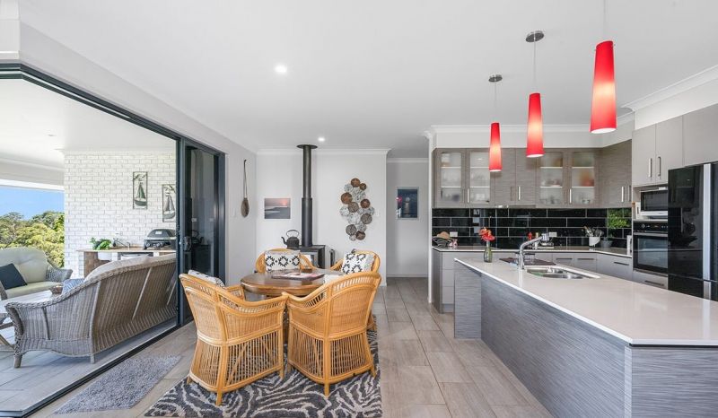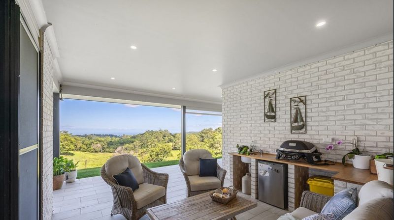 Step outside to an impressive outdoor setup featuring a covered alfresco area with outdoor kitchen, pizza oven, porch, and deck – perfect for entertaining or relaxing while taking in the rural outlook.