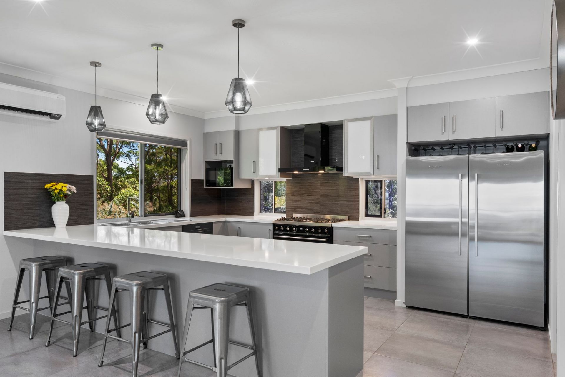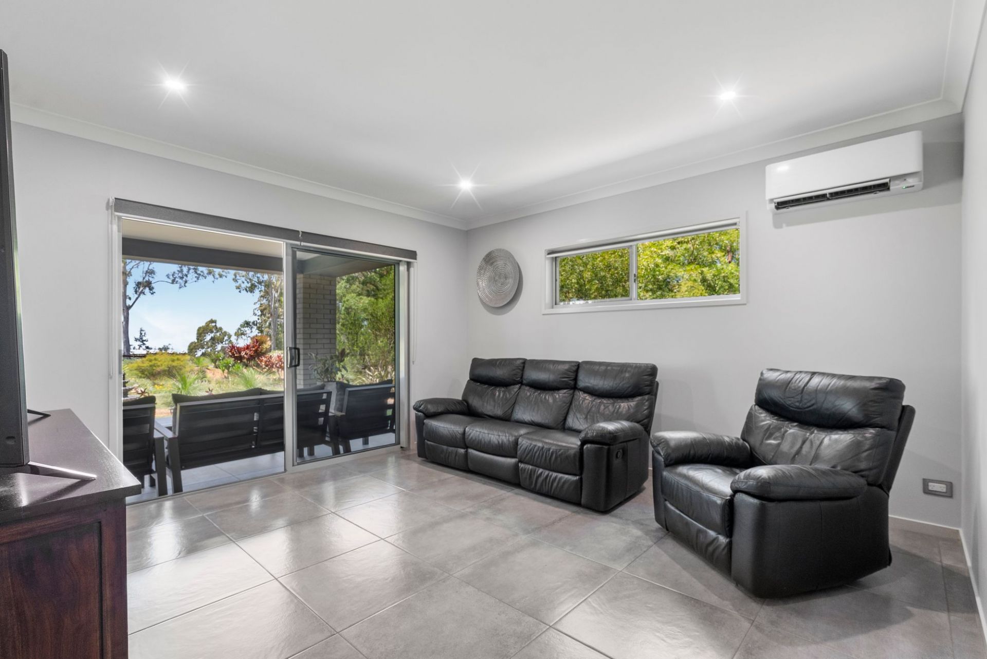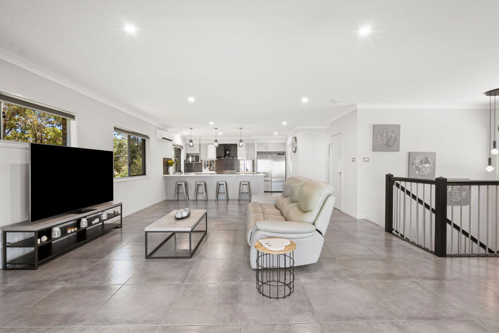 Architecturally designed and built by Ownit Homes in 2015, this highset brick residence delivers refined acreage living on 4.17 acres, with breathtaking coastal and hinterland views to Moreton Bay, Bribie Island and the Glass House Mountains. Combining light-filled open-plan living, a stylish kitchen with Caesarstone benchtops and SMEG appliances, a king-sized master suite retreat, and versatile downstairs family spaces, it’s the perfect balance of luxury, functionality and relaxed rural lifestyle.