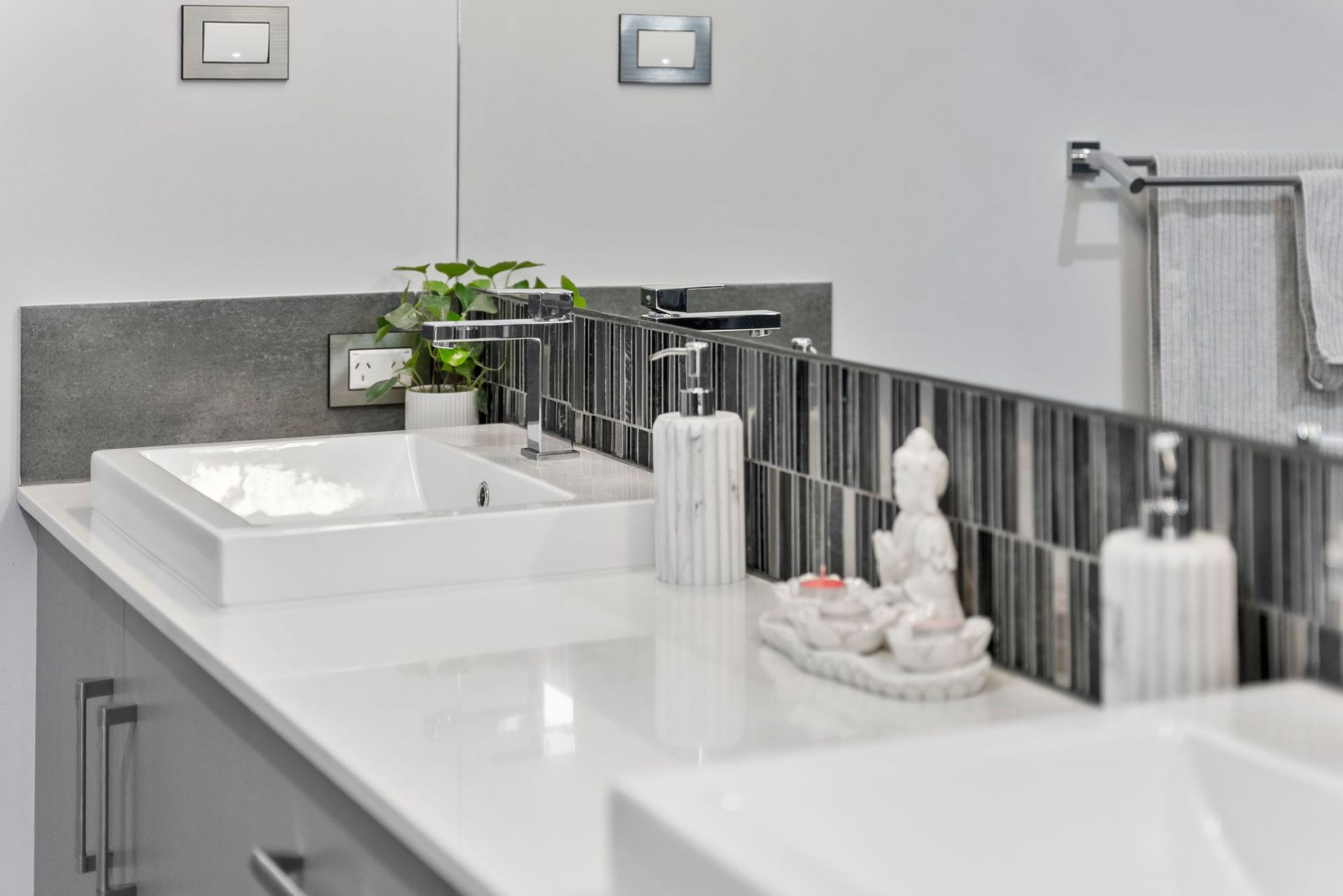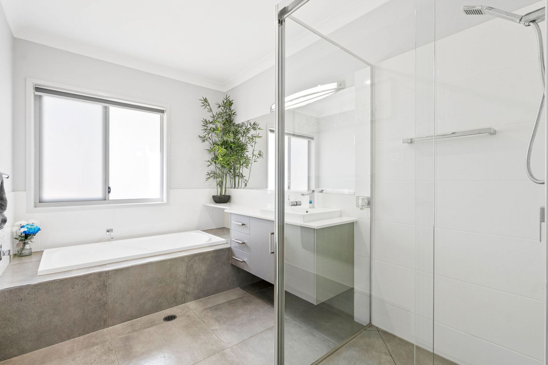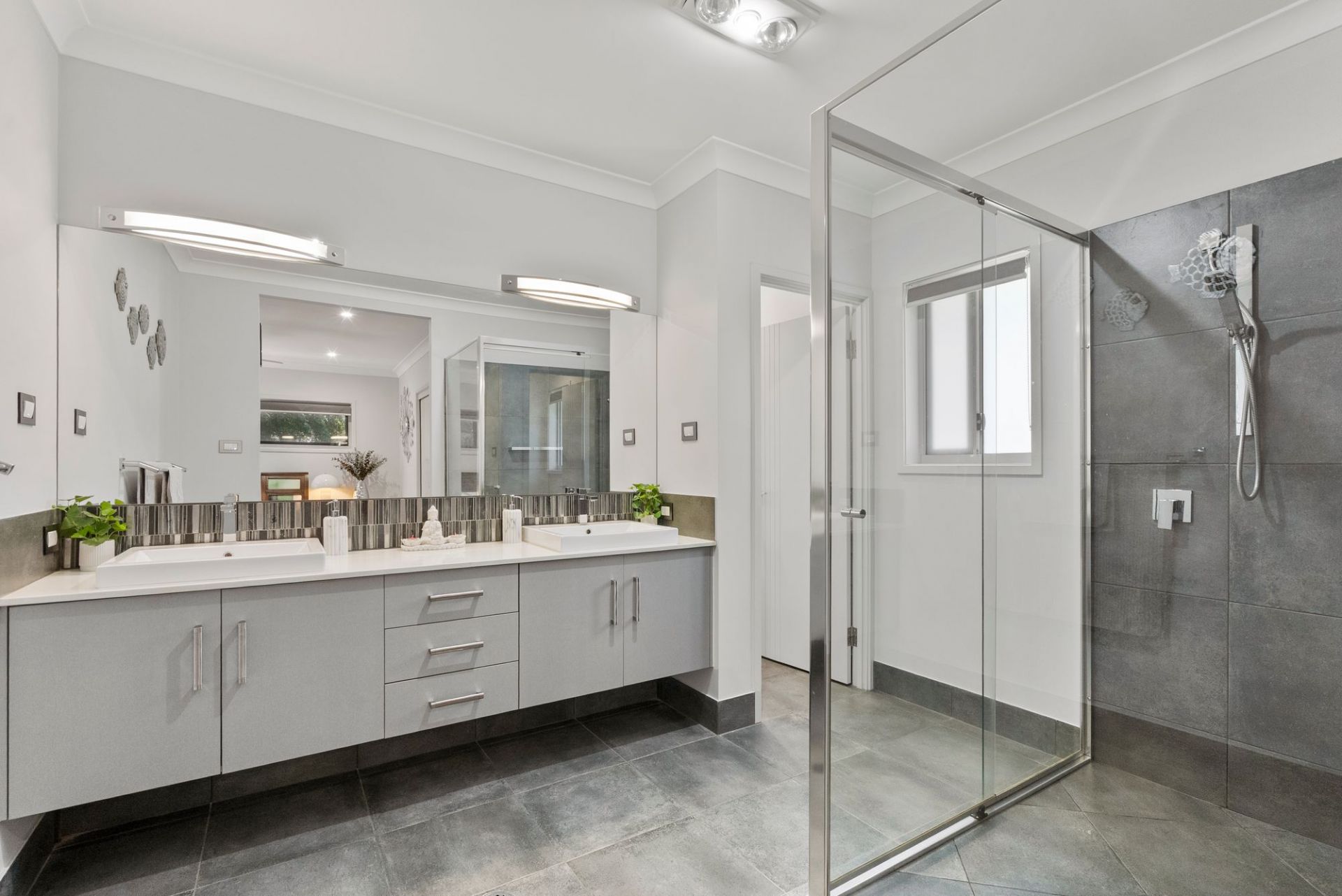 The master suite is a private retreat with a large walk-in robe and ensuite showcasing twin vanities, a generous shower, floor-to-ceiling tiles, stone benchtops, and a separate toilet. A convenient powder room services the upper level.