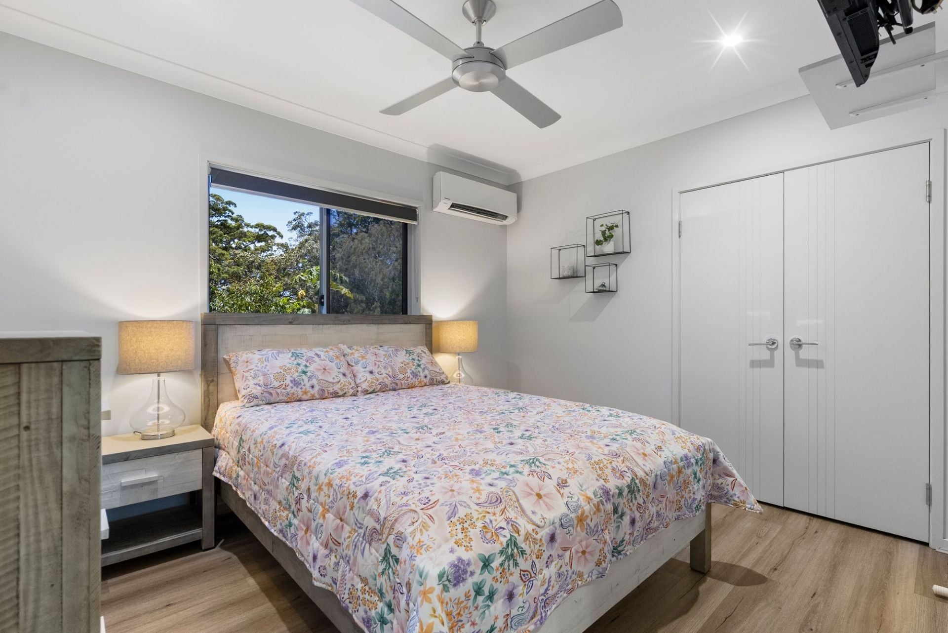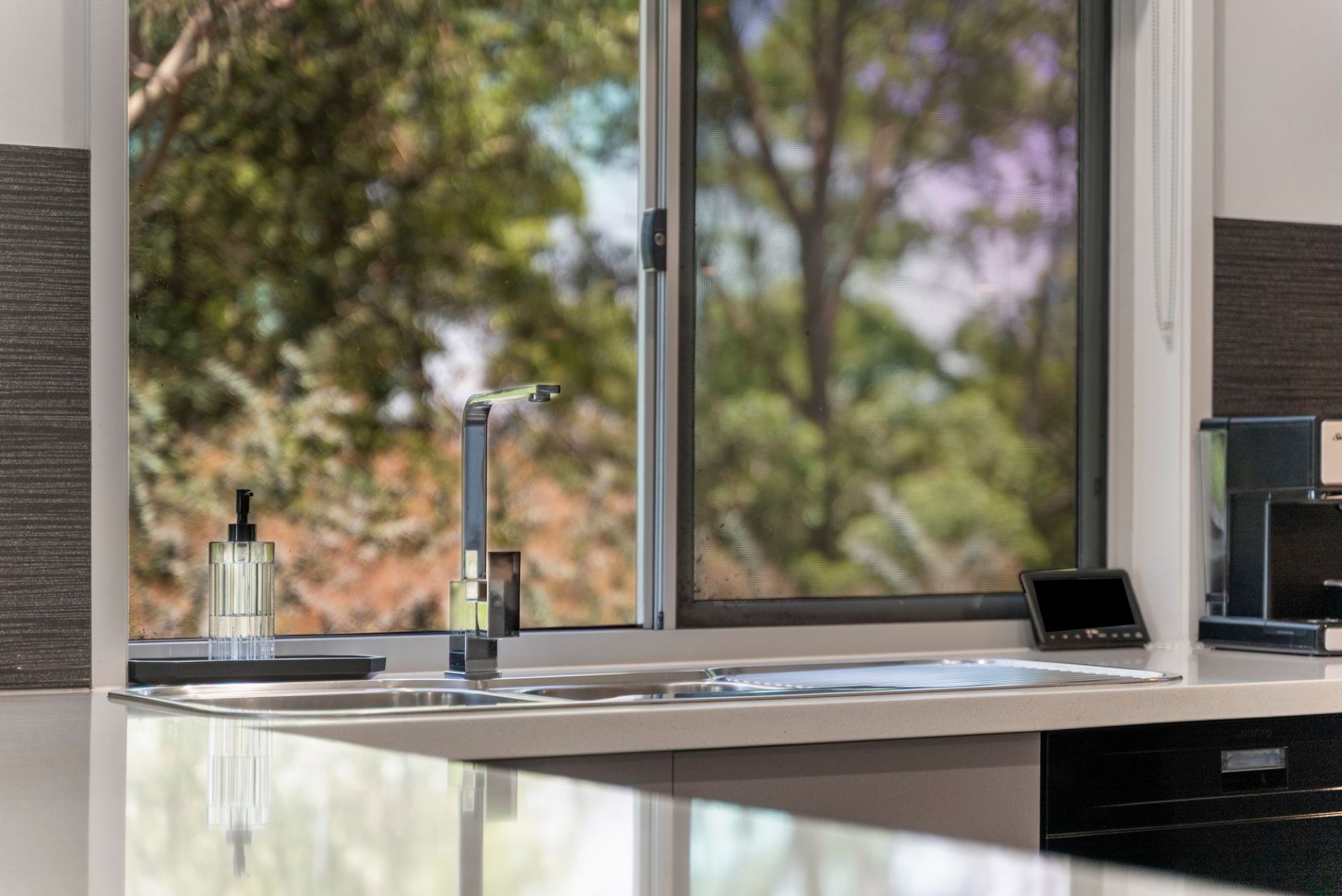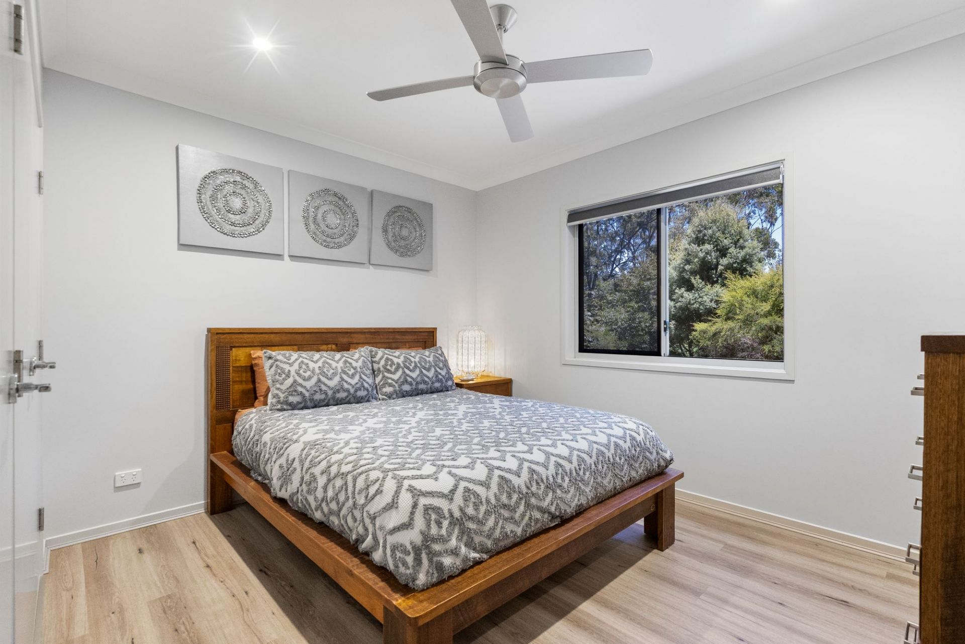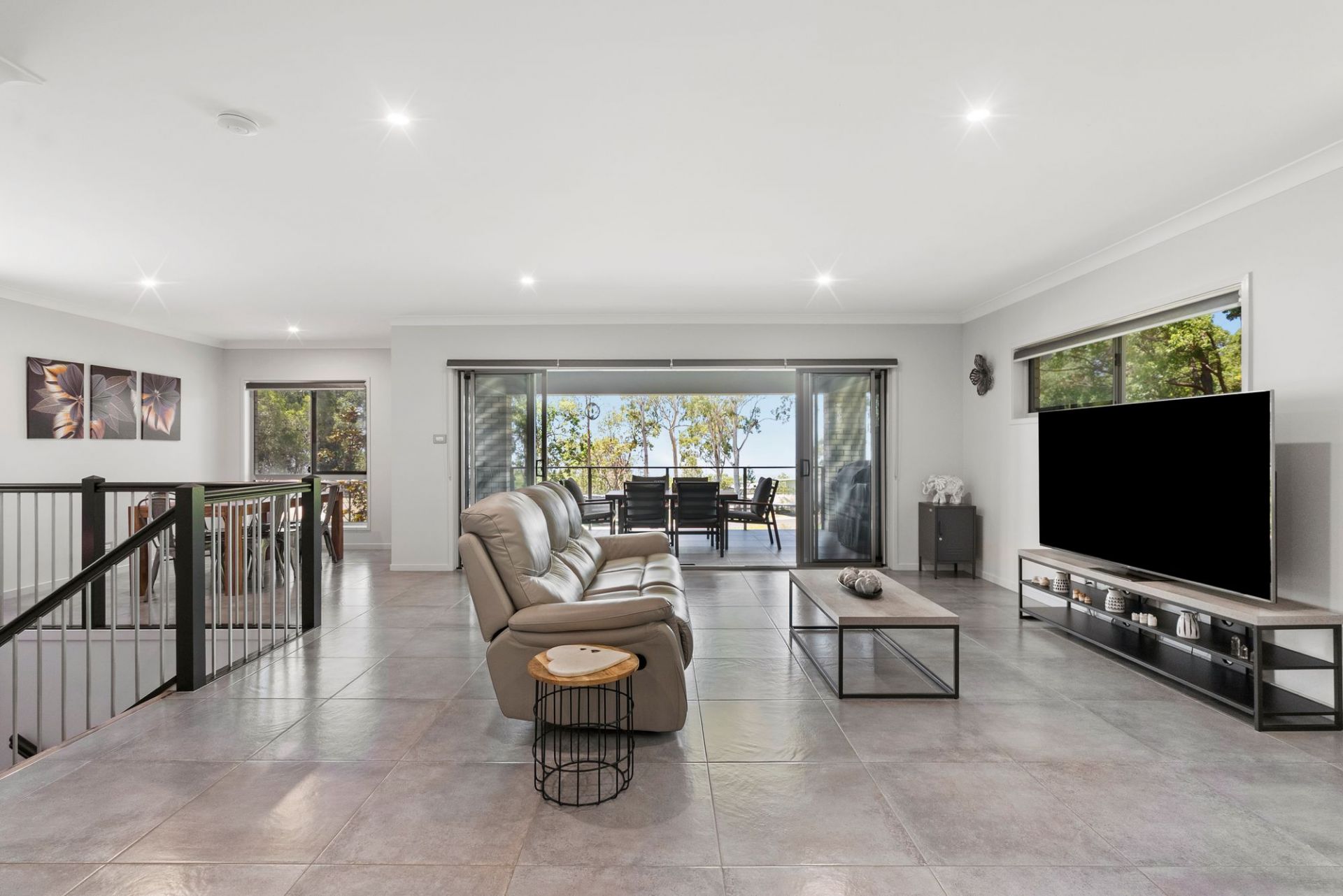 Upstairs, living, dining and kitchen areas flow seamlessly, enhanced by split-system air conditioning and expansive windows framing the spectacular surrounds. The well-appointed kitchen features a 900mm oven with gas cooktop, walk-in pantry, and opens onto a covered entertaining deck, ideal for hosting, enjoying sunsets or simply soaking in the views. Downstairs, a spacious rumpus provides a second living zone, complemented by three queen-sized bedrooms with built-in robes, a separate study, and a stylish main bathroom with shower, separate bath, stone benchtops and powder room.
