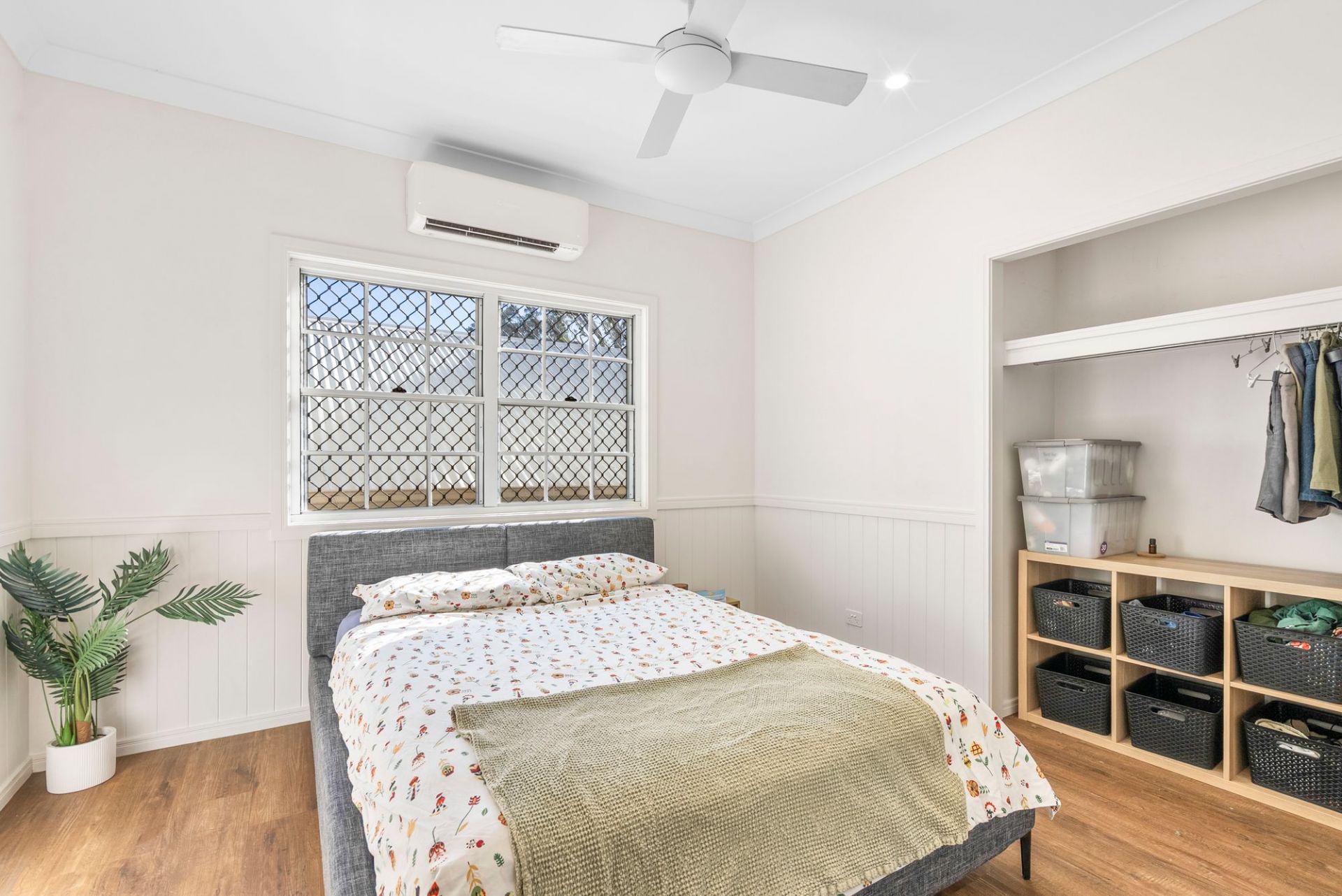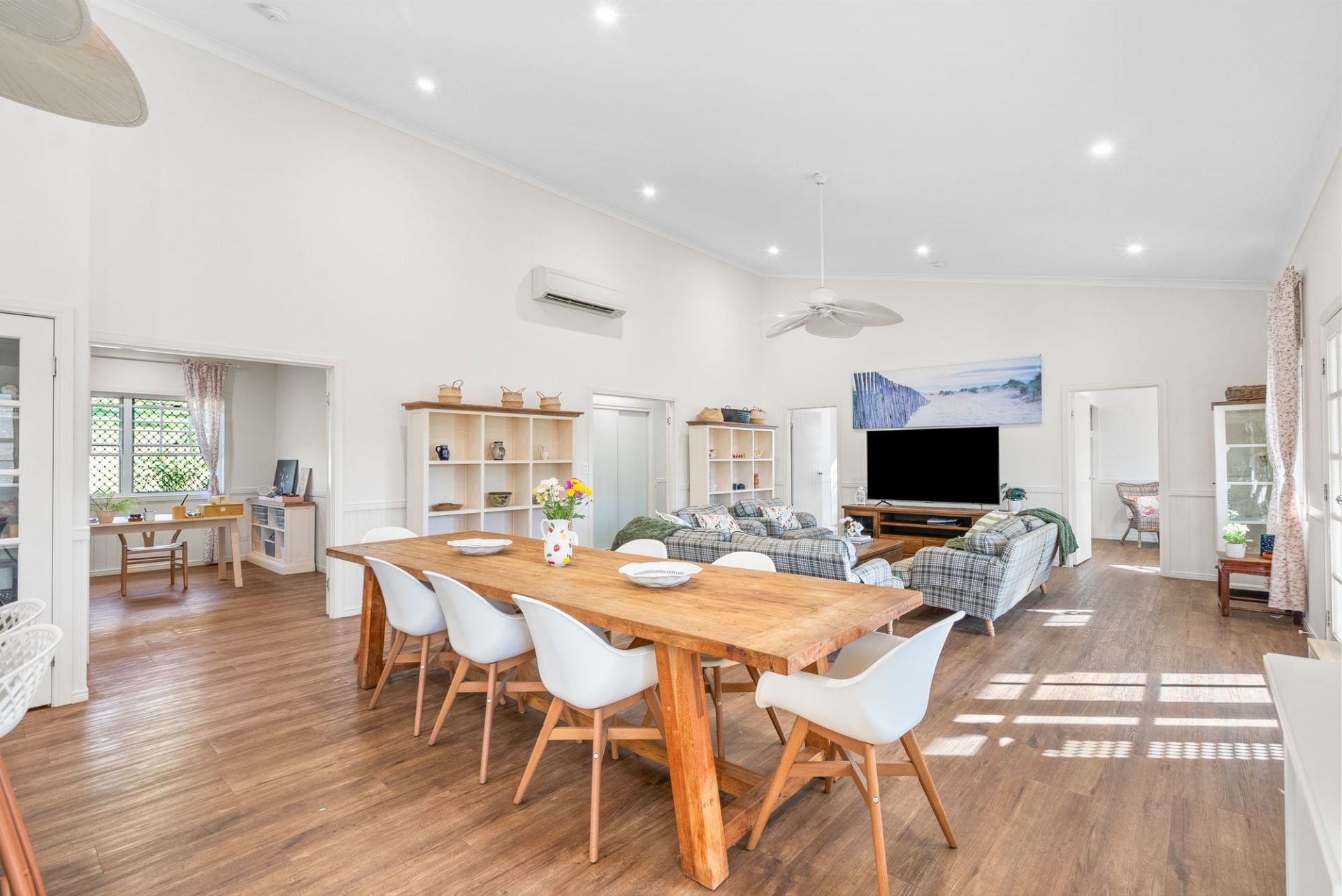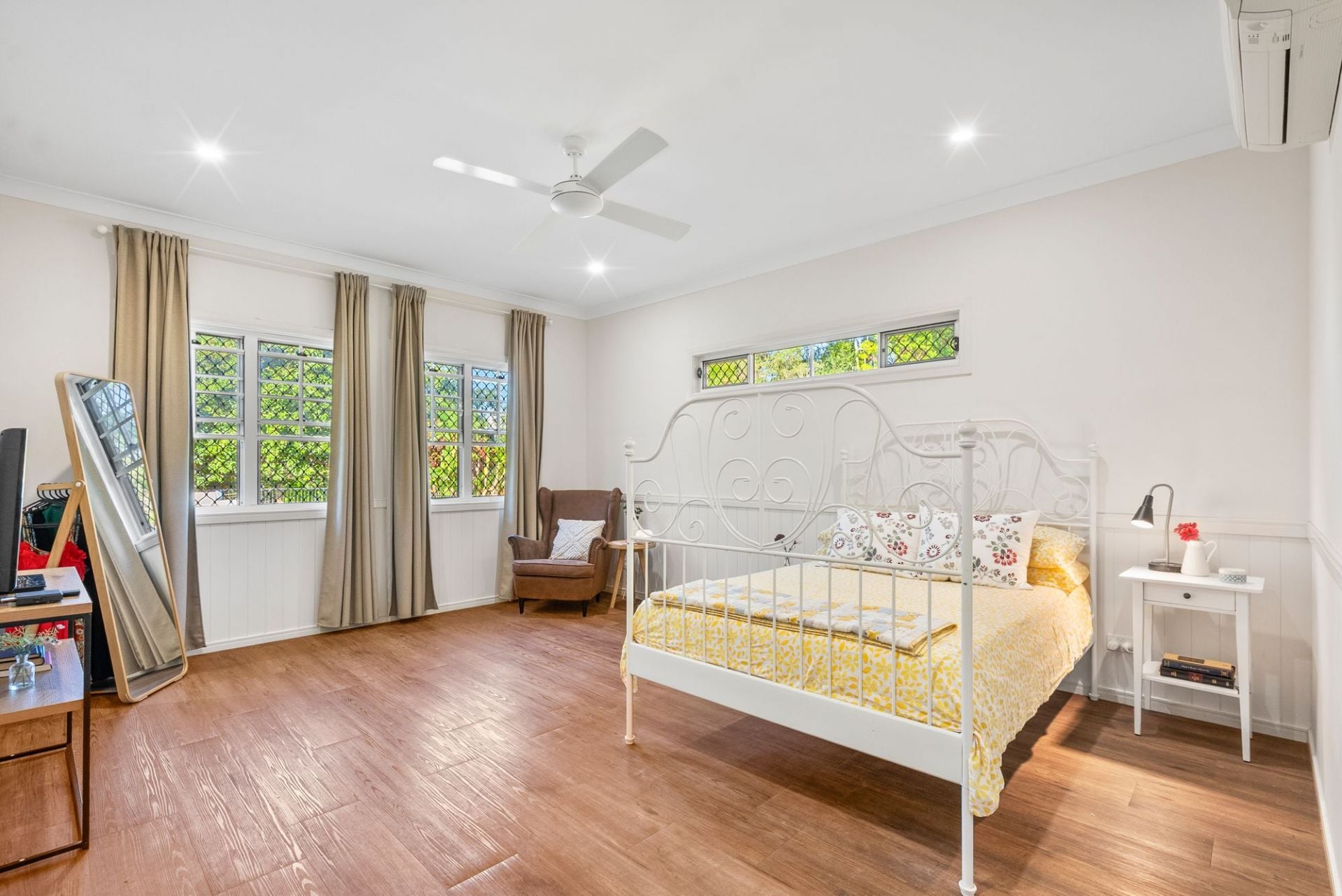 Built in 2017, the home offers a spacious master retreat with walk-in robe, ensuite and adjoining study or media room, complemented by three additional bedrooms with built-in robes and ceiling fans. Feature wall panelling, split-system air-conditioning, new fans and Crimsafe screens enhance comfort and security throughout.